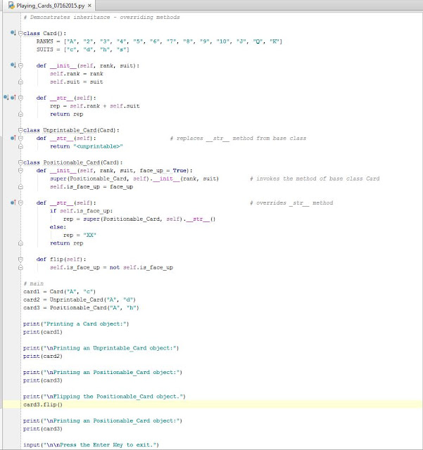 This program demonstrates inheritance and overriding methods. The Unprintable_Card class inherits the the Card class, but the __str__ method is overridden. See example below.